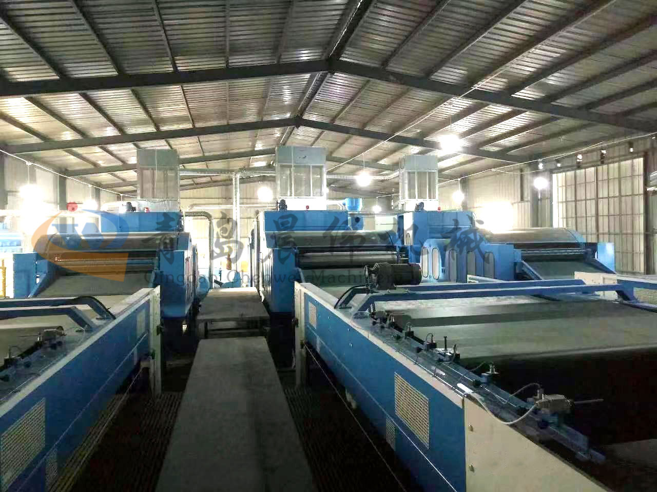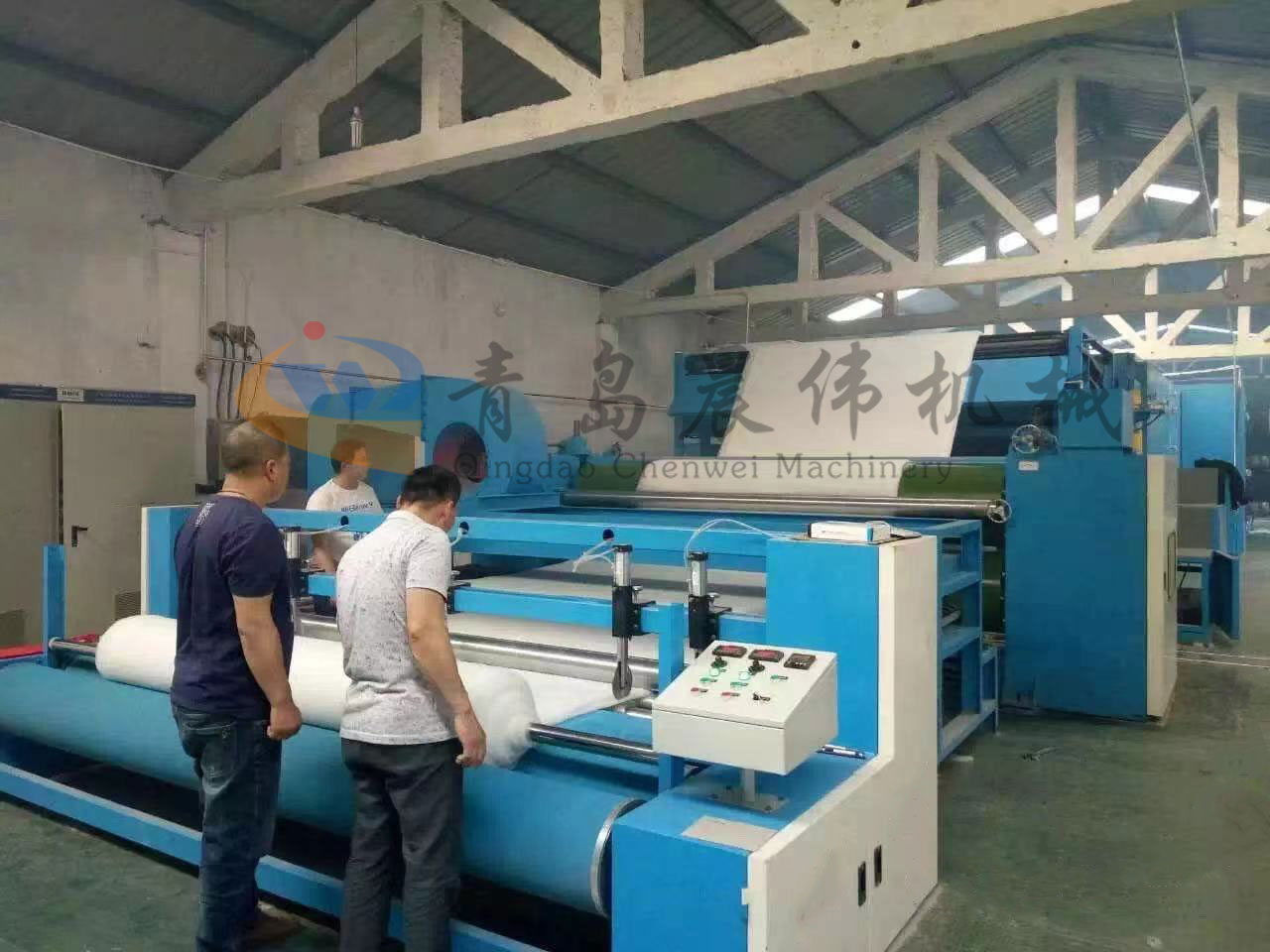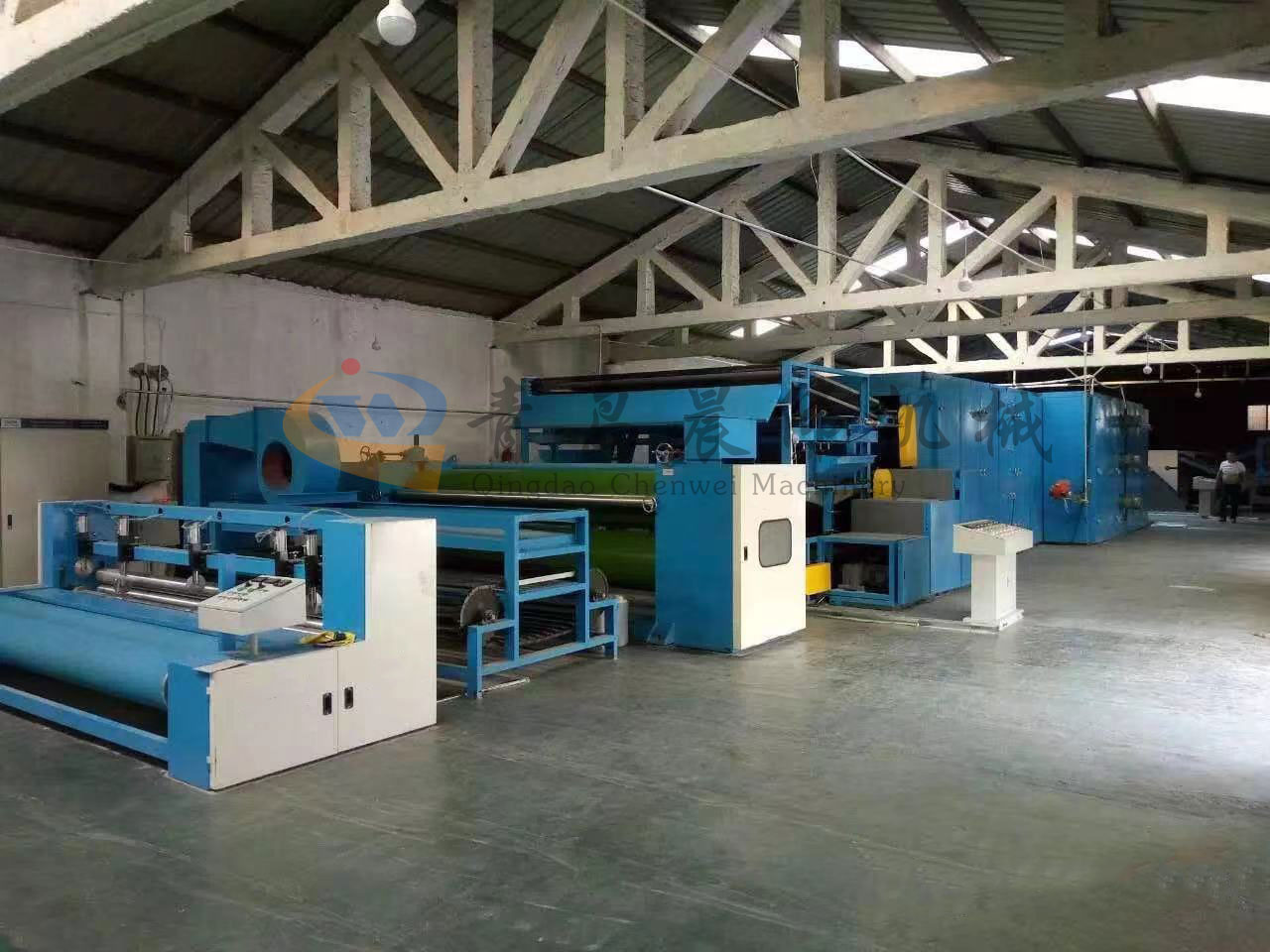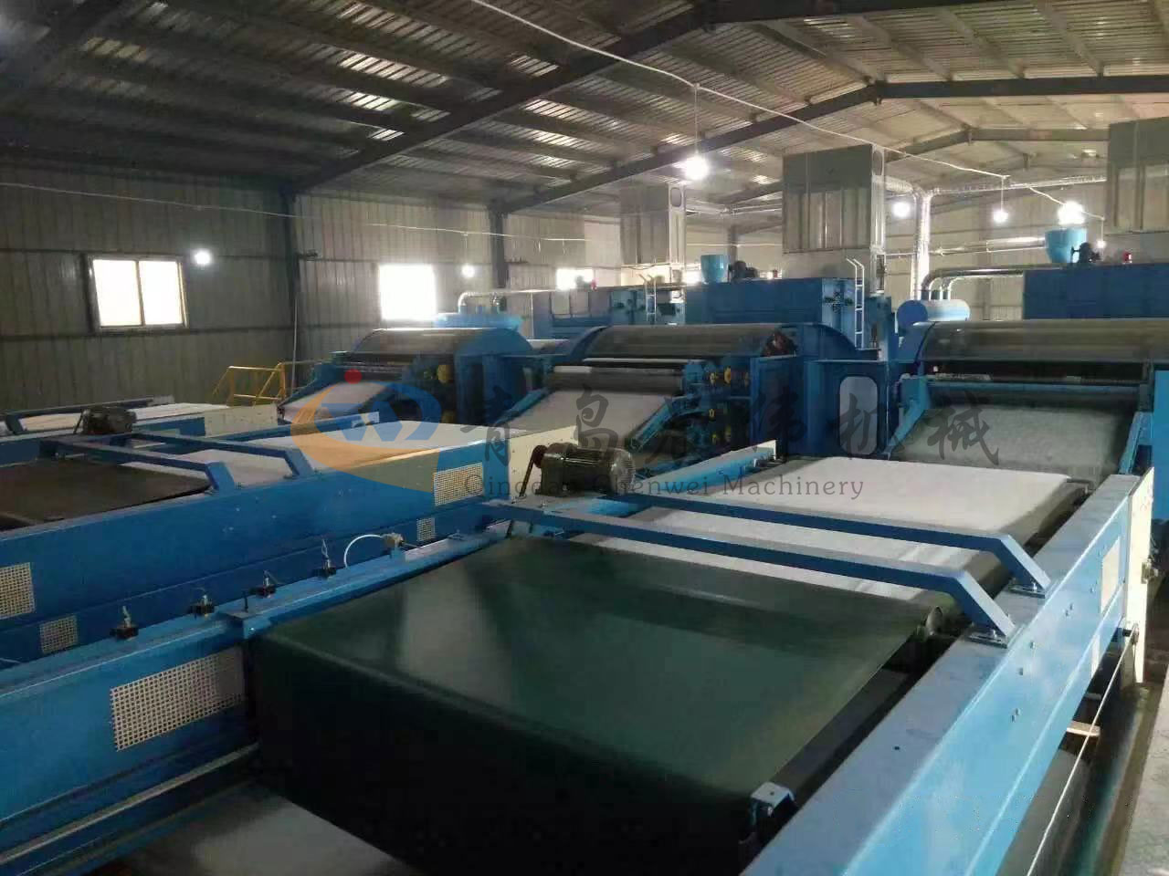 5. CWPW-鋪網(wǎng)機:用于將梳理纖網(wǎng)通過移動小車交叉折疊為所需幅寬和定量的多層纖網(wǎng),以供后道工序使用。鋪網(wǎng)輥采用特殊結(jié)構(gòu),加裝壓網(wǎng)輥和導(dǎo)流板,不飄網(wǎng)不起皺,五只大功率電機精確控制各部件的運動,電動輸出簾高度調(diào)節(jié)裝置。