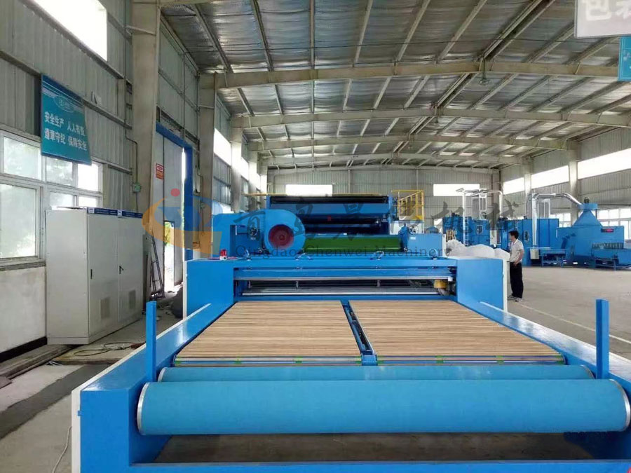 5. CWPW-鋪網(wǎng)機(jī):用于將梳理纖網(wǎng)通過(guò)移動(dòng)小車交叉折疊為所需幅寬和定量的多層纖網(wǎng),以供后道工序使用。鋪網(wǎng)輥采用特殊結(jié)構(gòu),加裝壓網(wǎng)輥和導(dǎo)流板,不飄網(wǎng)不起皺,五只大功率電機(jī)精確控制各部件的運(yùn)動(dòng),電動(dòng)輸出簾高度調(diào)節(jié)裝置