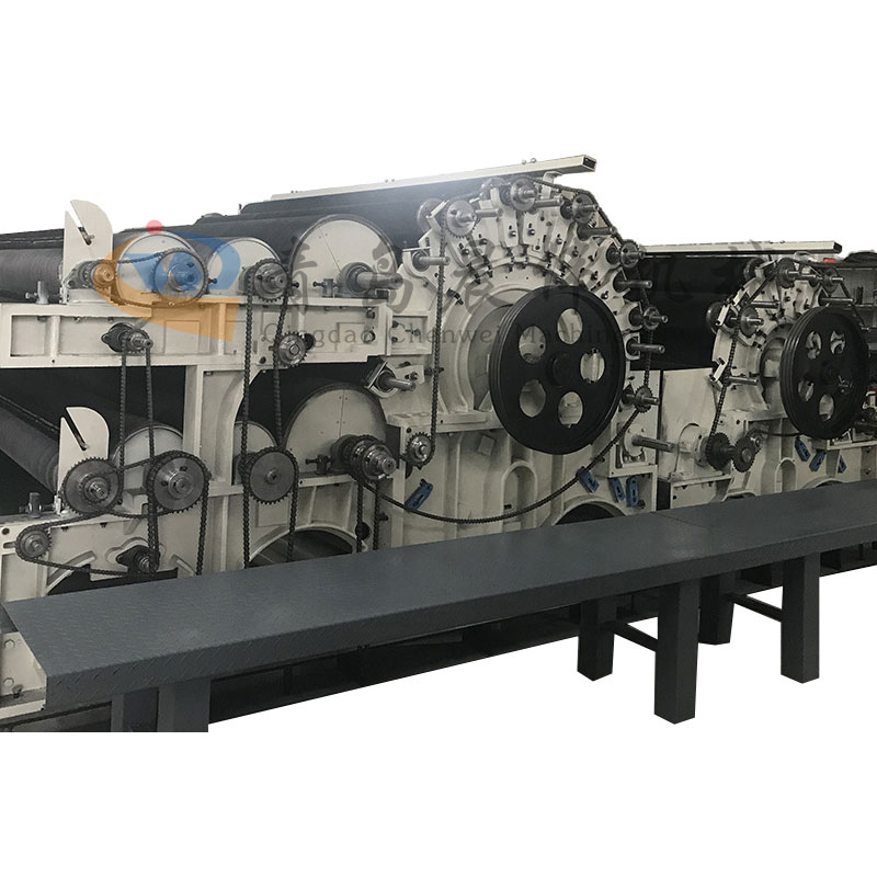 雙錫林梳理機(jī)主要是將前道工序棉網(wǎng)層進(jìn)行單纖維狀態(tài)分散過(guò)程,并且等寬均勻的輸出到鋪網(wǎng)機(jī),雙錫林梳理機(jī)適用于針刺。